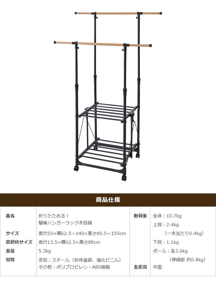 ■商品名折りたためる ハンガーラック 木目調 多機能H型■サイズ使用時:幅62.5〜99×奥行き50×高さ92.5〜155cm収納時:幅62.5×奥行き13.5×高さ88cm■材質支柱:スチール(粉体塗装、塩化ビニル)その他:ポリプロピレン・ABS樹脂■耐荷重全体:10.7kg上段:2.4kg(一本当たり0.4kg)下段:1.1kgポール:各3.6kg(伸縮部 約0.8kg)【送料について】北海道、沖縄、離島は別途送料を頂きます。