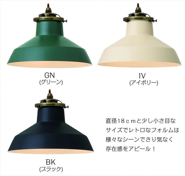 ■ サイズ シェードサイズ:φ18cm×H13cm シーリングカバーサイズ:φ9cm×H9cm コード調整:全高39cm〜98cmまでの間で調節可能 ■ カラー グリーン、アイボリー、ブラックより選択 ■ 材 質 スチール ■ 仕 様 ※電球は別売りです。